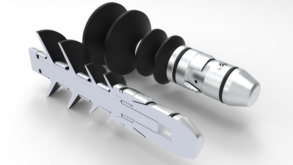 The float shoe guides the liner string smoothly into the well bore during lowering. Its body incorporates metal and tungsten carbide blades to efficiently ream and clean the hole. The internal, typically double-plunger, valves prevent fluid entry into the liner. Aluminum internal parts provide high strength and are PDC-drillable.